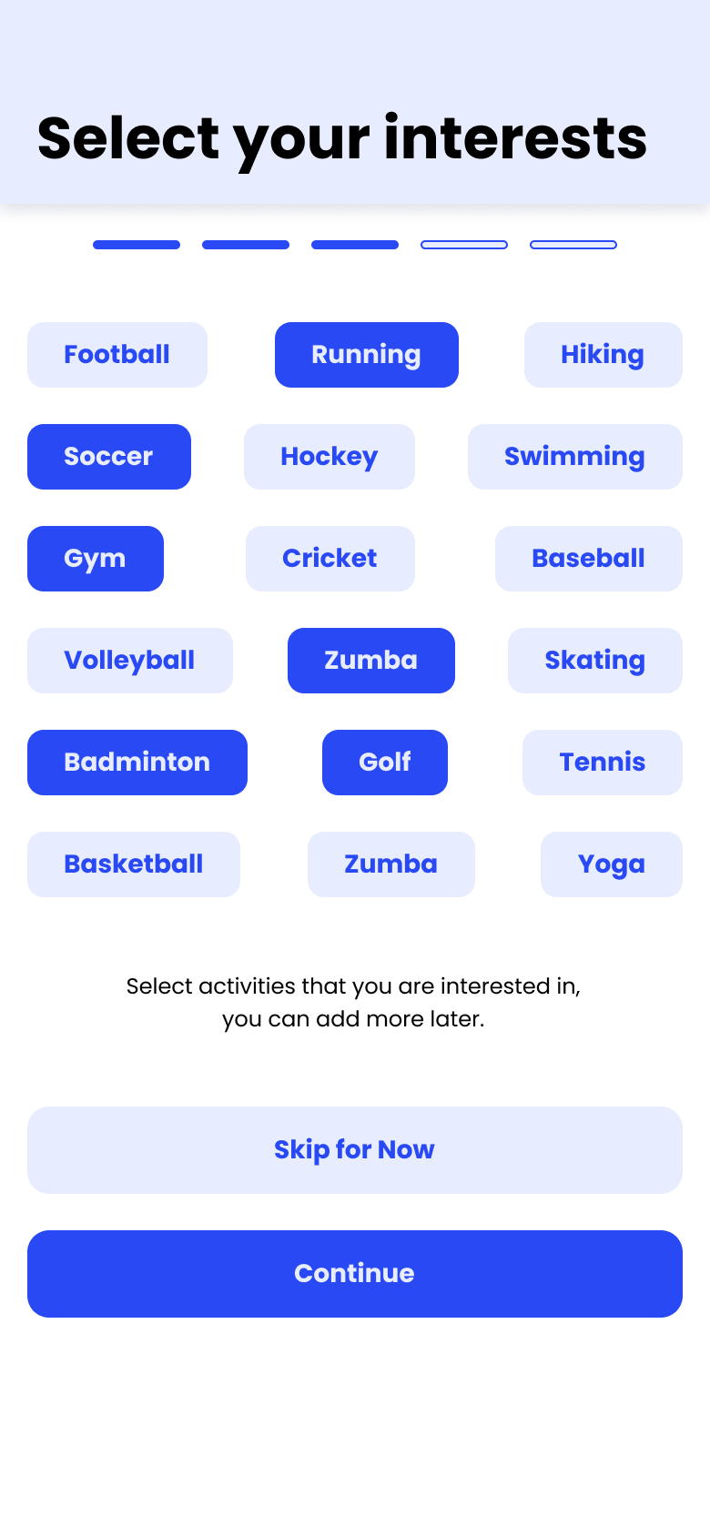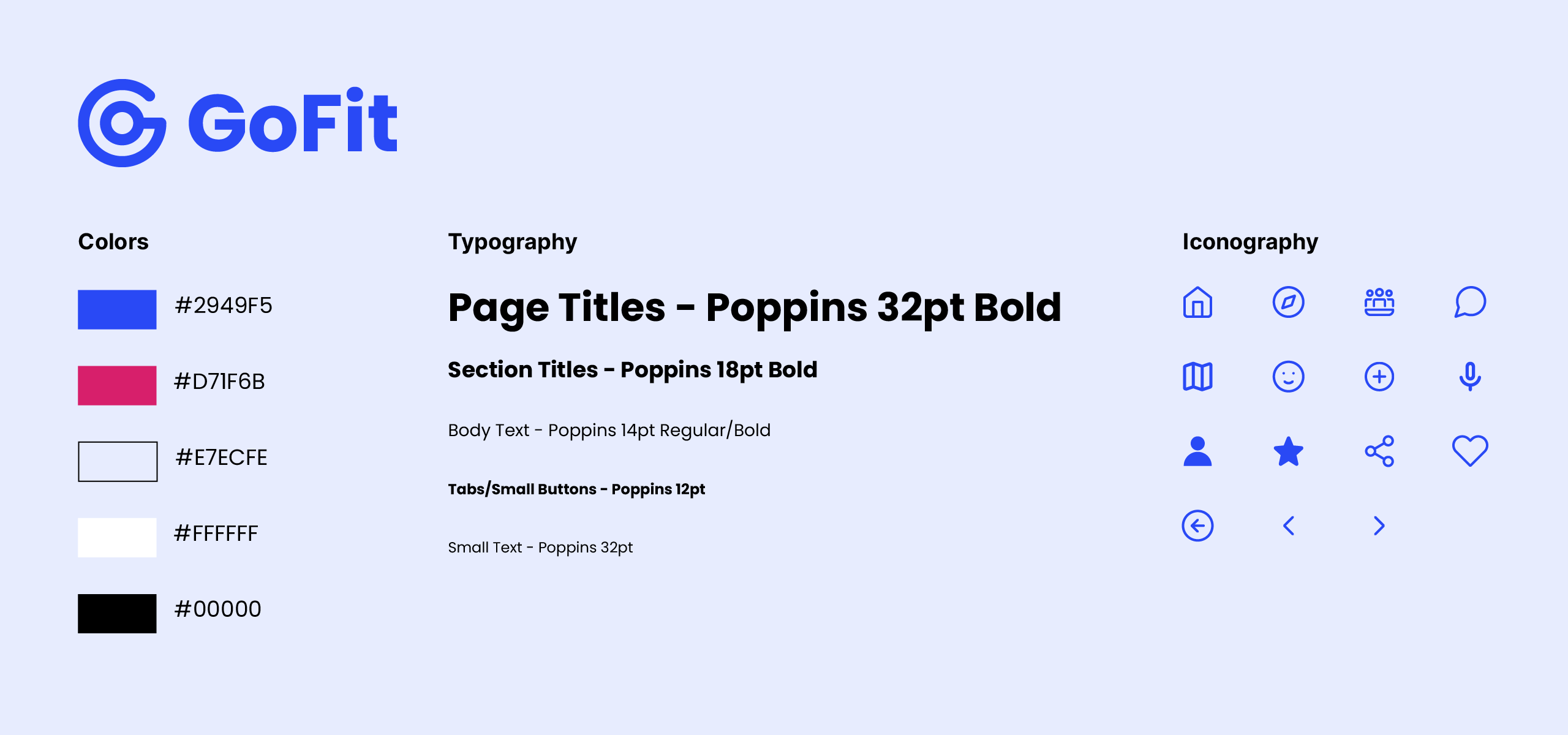 The visual system needed to feel energetic and approachable — an active primary blue with a warm accent, Poppins for readability across all screen sizes, and a tight icon set mapped to the four core feature areas.