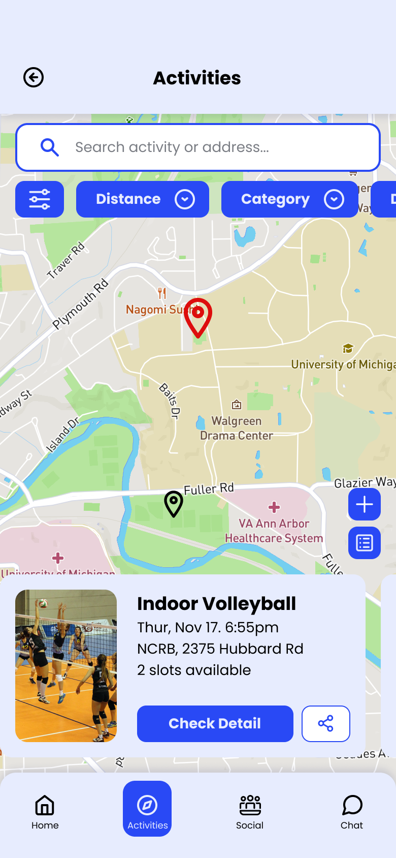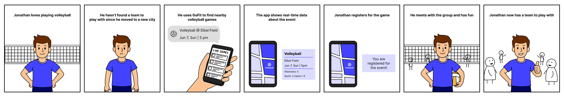 He finds a local volleyball event, RSVPs, shows up, and meets people with shared interests. The app handles discovery and coordination.
