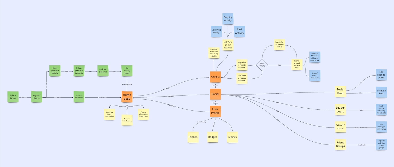 We built a user flow to map the exact sequence of steps users take — which locked in four core areas: Activity Discovery, Social Feed, Friend Groups, and Personal Tracking. Anything outside these four didn't make the cut.