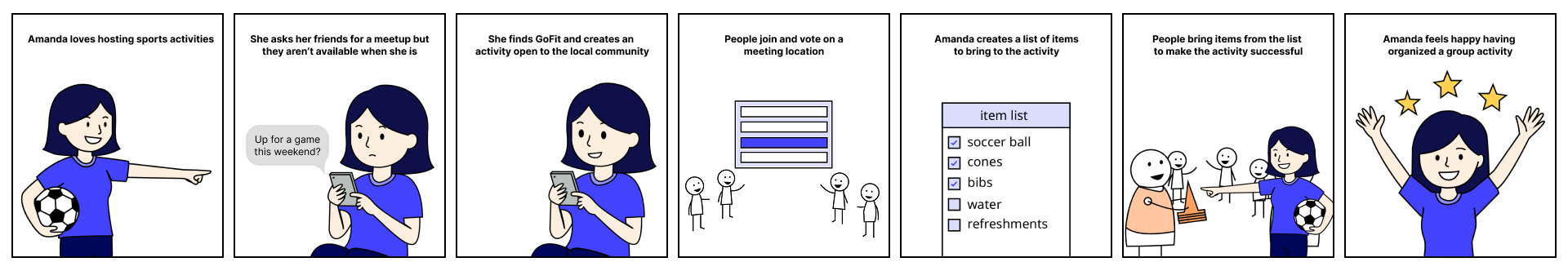She creates a group soccer game, adds a checklist of what to bring, people show up prepared, they play together, and she feels the satisfaction of a plan that actually worked.