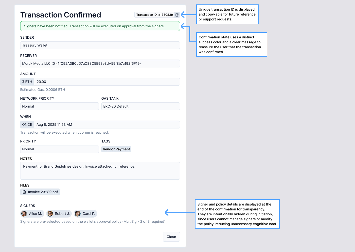 This project explores the design of a transaction initiation flow for custodial multi-signature (multi-sig) wallets used by financial institutions. It focuses on Ethereum (ETH) and Solana (SOL) to demonstrate how a single UX pattern can scale across different blockchains while handling core transaction details and chain specific considerations.